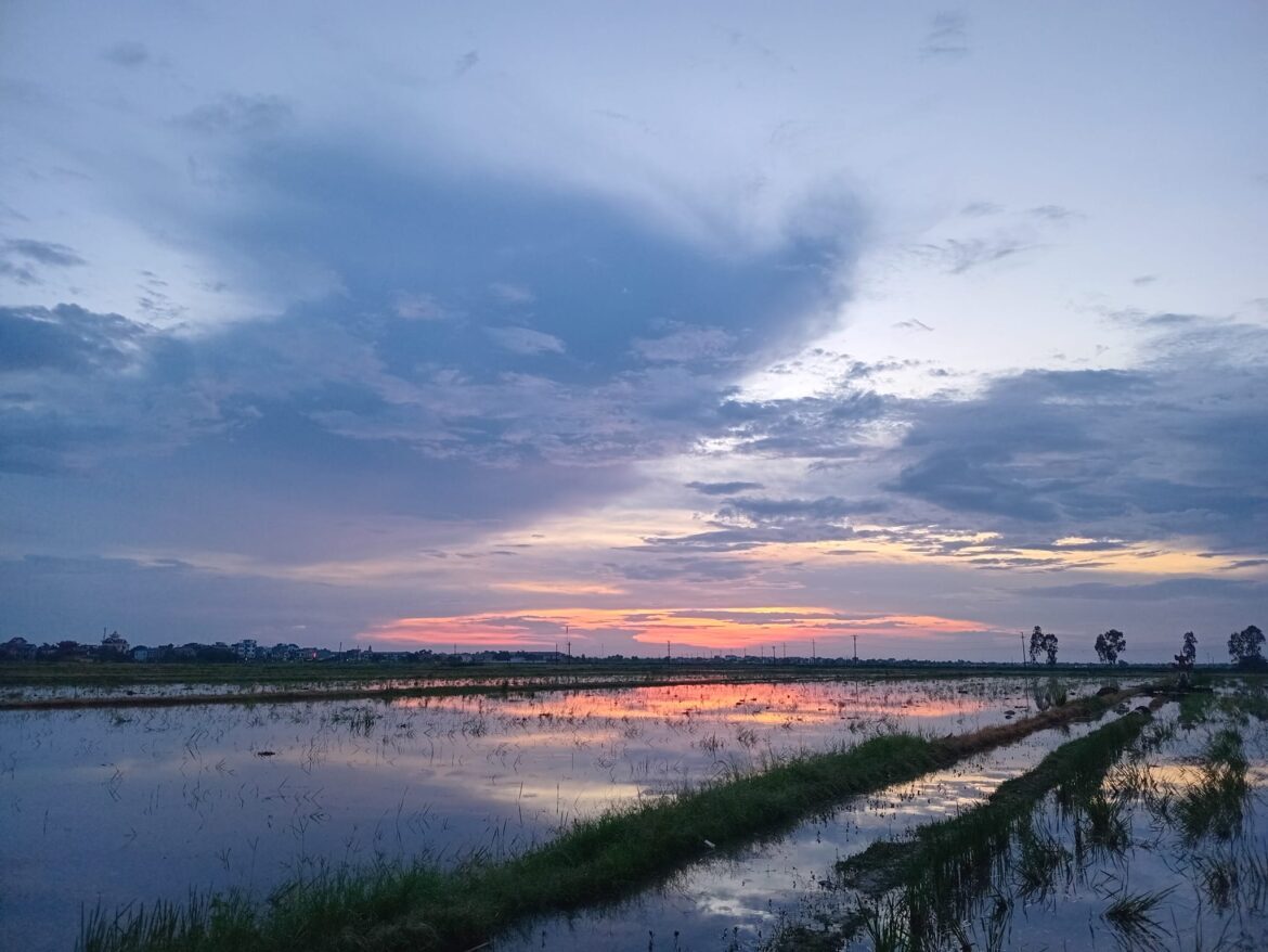 trên cánh đồng quê nước ngập đến lưng gốc rạ, soi bóng ráng chiều đỏ ối tít tận đường chân trời.